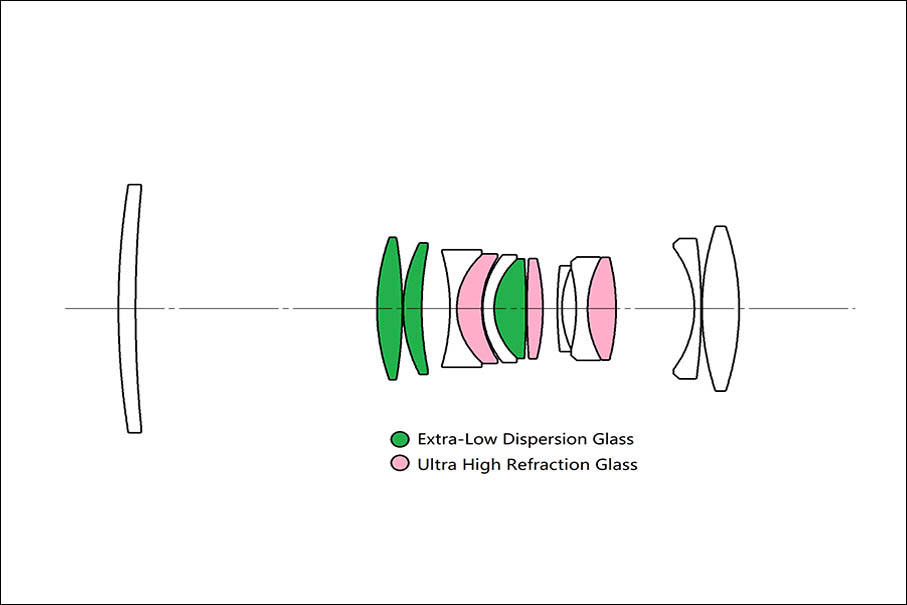 Objektiv je vybavený třemi apochromatickými (APO) členy, díky kterým zcela zaniká chromatická aberace v celém ostřícím rozsahu, a to jak v ostrých, tak v rozostřených částech snímku. Aberace na hranách a stíny v obraze jsou díky optické konstrukci potlačeny na minimum.